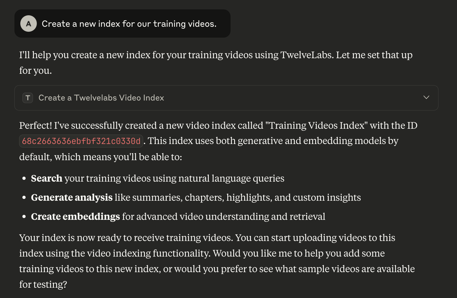 If you use Claude Code, the Claude Code plugin is an alternative that adds TwelveLabs slash commands directly to your Claude Code workflow.