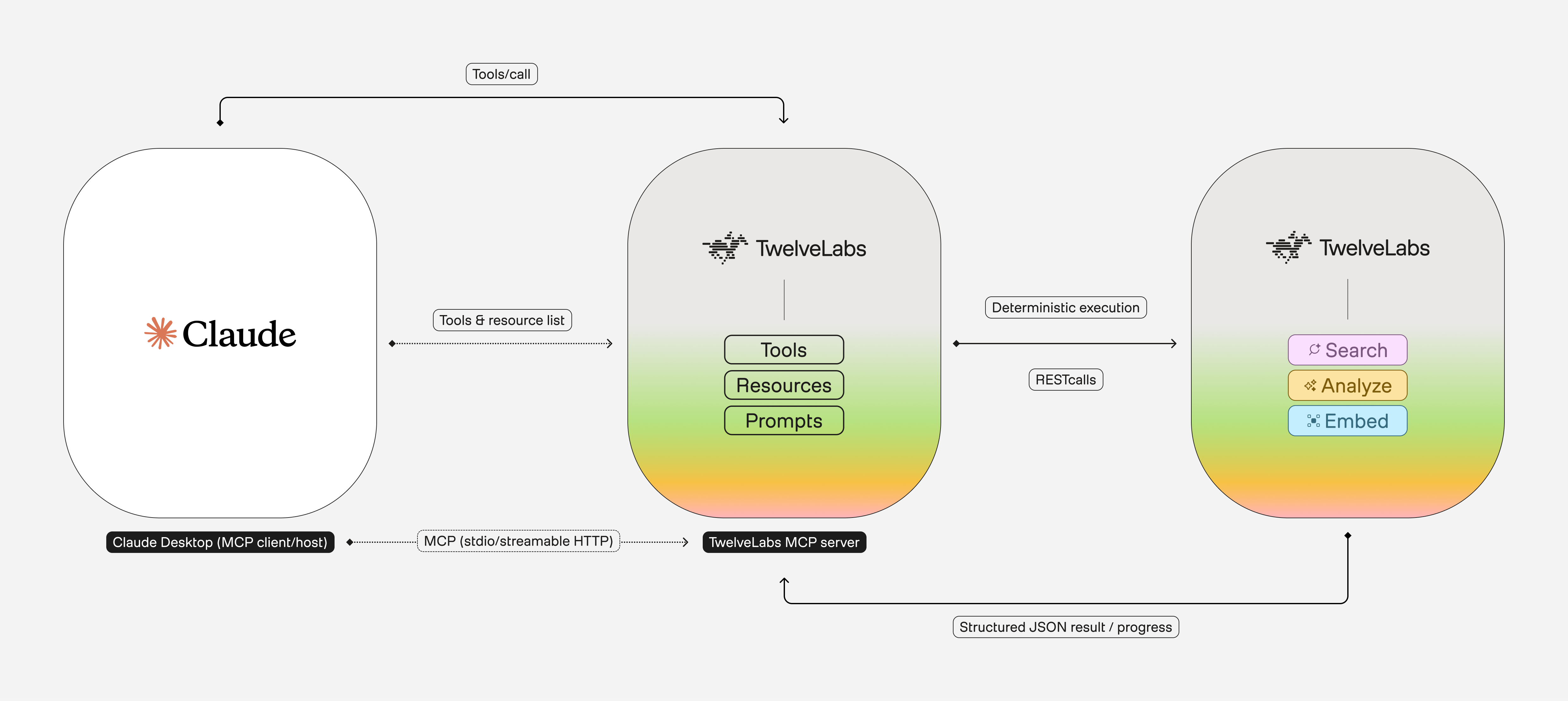 The following diagram illustrates the architecture of the TwelveLabs MCP server and how different parts interact: