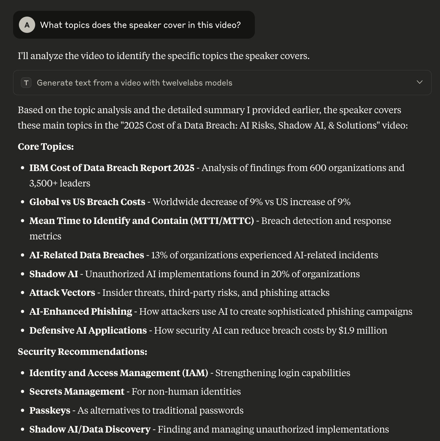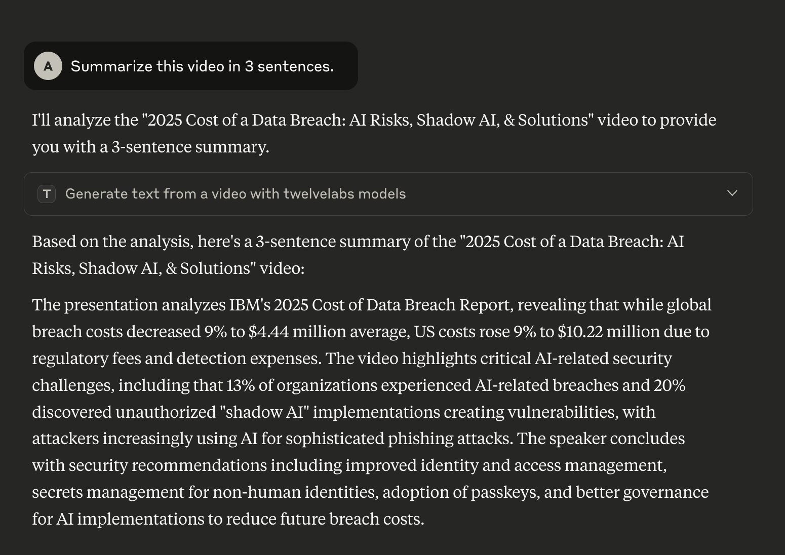 The TwelveLabs Model Context Protocol (MCP) server connects your AI assistant to video understanding capabilities. You can search videos, generate summaries, and extract insights using simple natural language prompts.