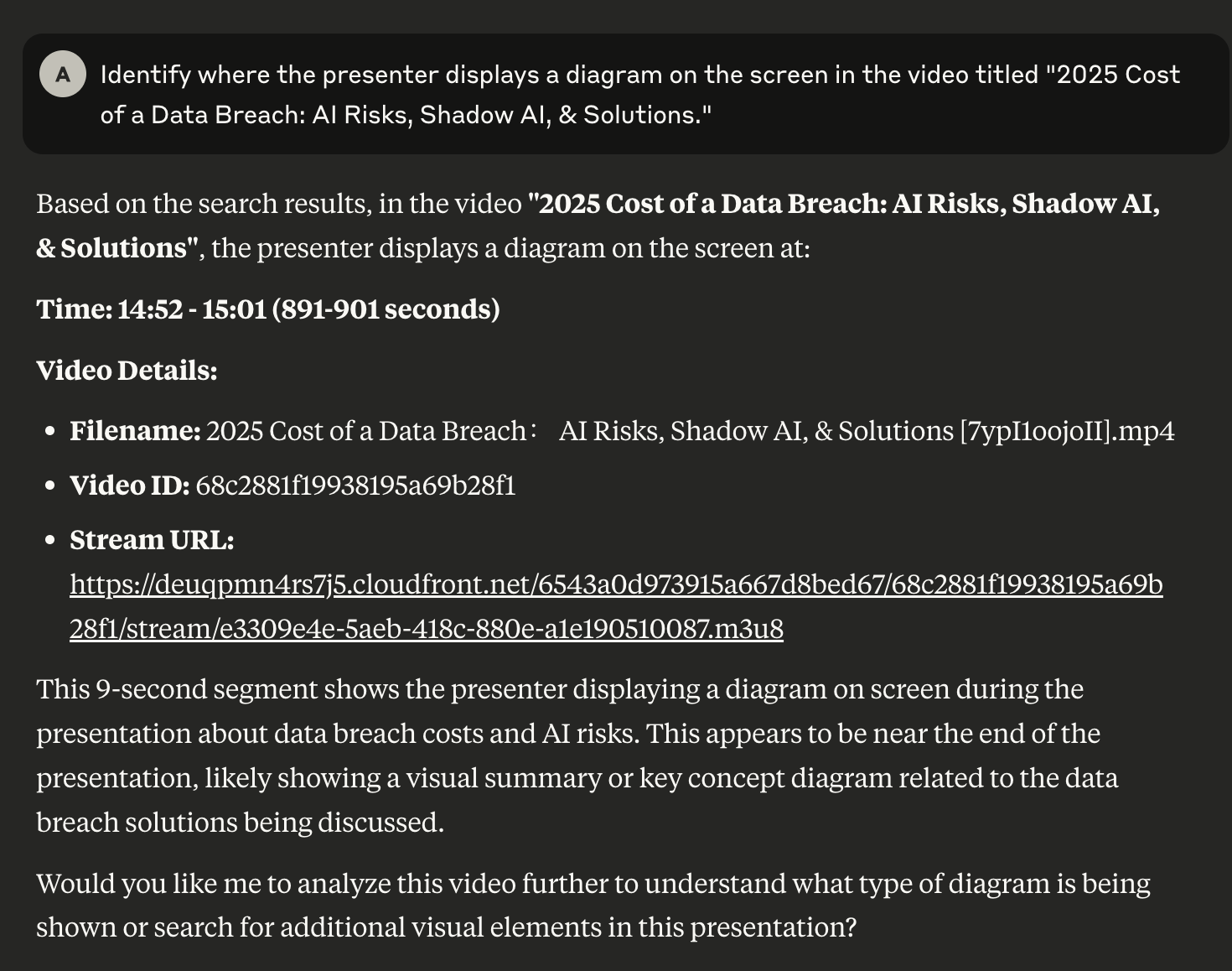 - Video search: Search through indexed videos using natural language queries to find specific moments and scenes.