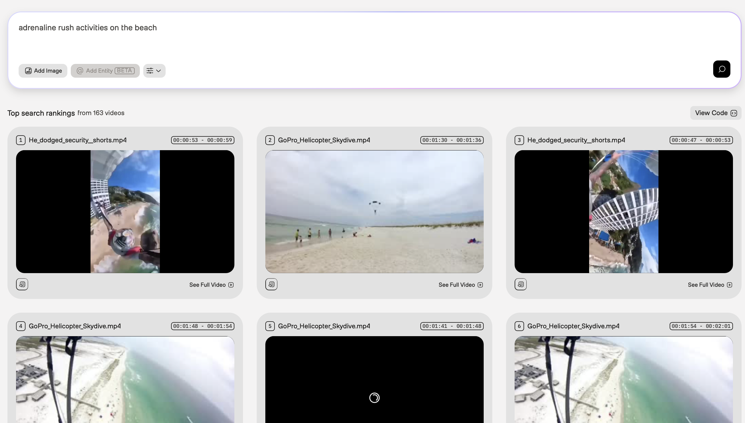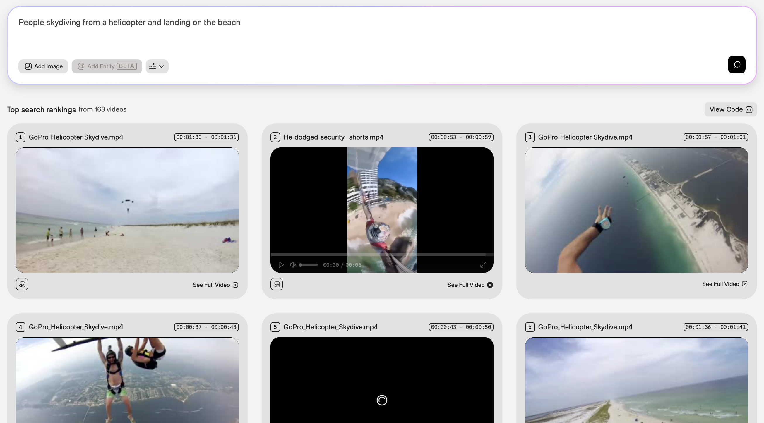 In the screenshot above, the first search result is from a video showing people skydiving from a helicopter, and you want to find more videos similar to this. To do so, you can refine your query even further by specifying both the activity and the location -