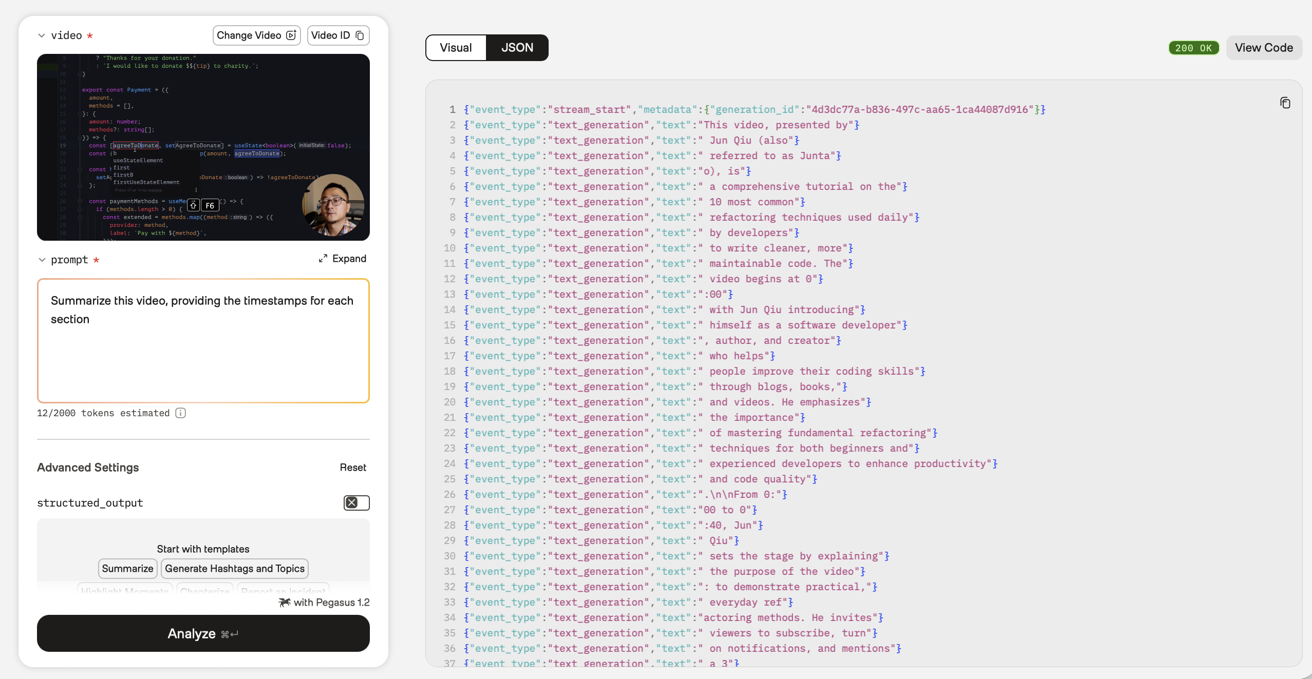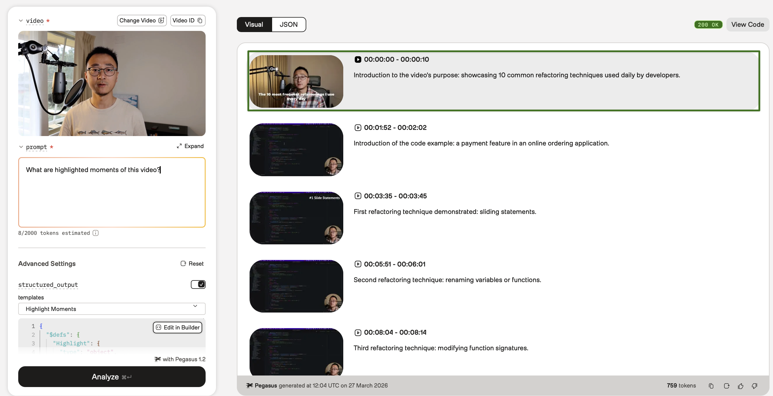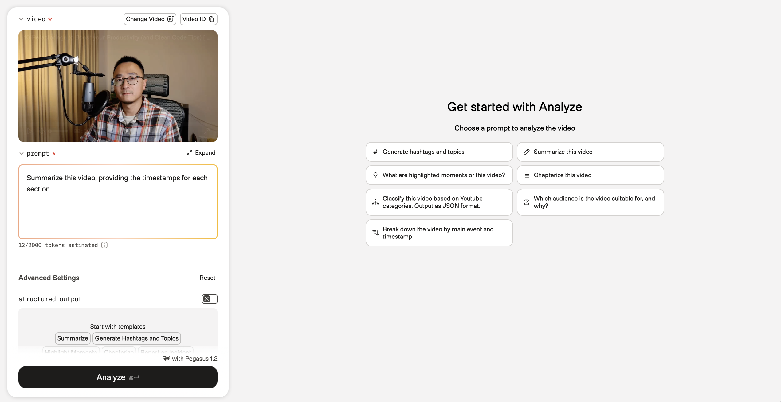 • This feature is available only for indexes with the Pegasus video understanding engine enabled. See the Create an index section for details.